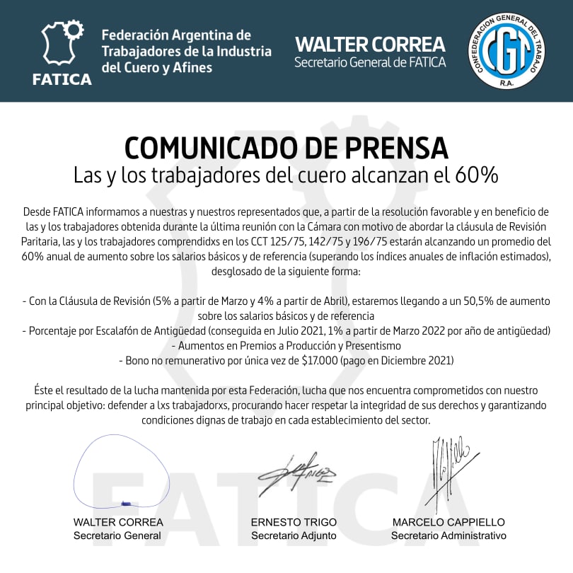 En virtud de la cláusula de revisión para las y los curtidores, la FATICA logró el 60 por ciento para los Convenios 125/75, 142/75 y 196/75.
