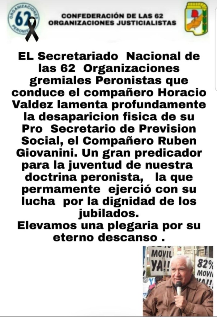 Horacio Valdez, secretario general de las 62 organizaciones sindicales peronistas, hace llegar a familiares y amigos el saludo y el pesar por el fallecimiento del Pro secretario de Prevision Social de la organización, Ruben  Giovanini.