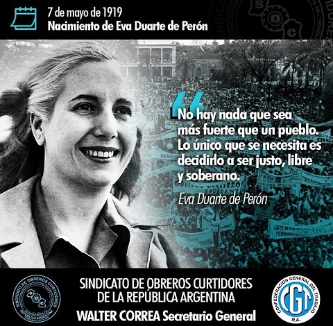 Hoy, 7 de mayo, el Sindicato de Obreros Curtidores de la República Argentina recuerda el natalicio de Evita, madrina de esta Organización. En un breve pero apasionado acto, y en representación del General Perón, fue Evita quien designó al actual edificio de nuestro Sindicato como casa de las y los curtidores, en el año 1949.