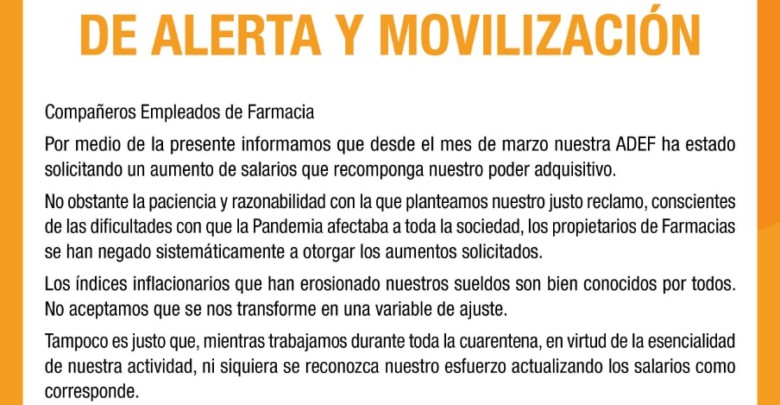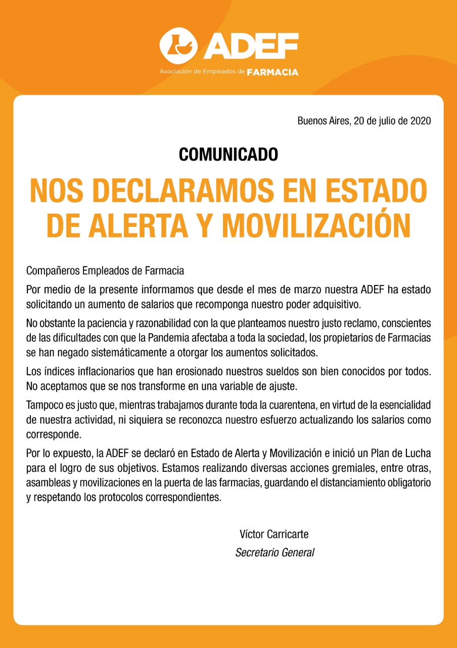 La Asociación de Empleados de Farmacia -ADEF-, que conduce Víctor Carricarte, reclama “un aumento salarial justo para las trabajadoras y trabajadores del sector” con el objetivo de recomponer el poder adquisitivo, sin perder de vista el “rol fundamental” y el “carácter esencial” de la actividad de las trabajadoras y trabajadores de farmacia en el marco de la pandemia de Covid-19.