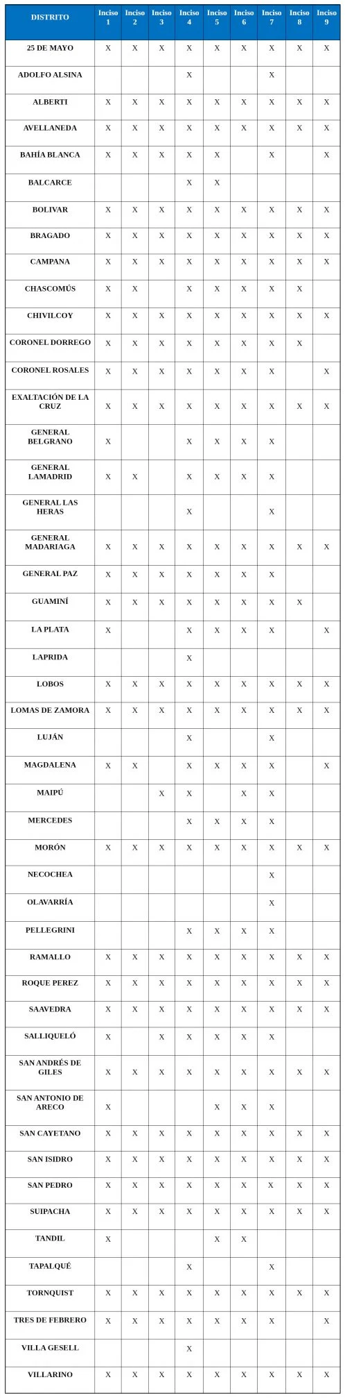 Se trata de los distritos de 25 de Mayo, Adolfo Alsina, Alberti, Avellaneda, Bahía Blanca, Balcarce, Bolívar, Bragado, Campana, Chascomús, Chivilcoy, Coronel Dorrego, Coronel Rosales, Exaltación de la Cruz, General Belgrano, General Lamadrid, General Las Heras, General Madariaga, General Paz, Guaminí, La Plata, Laprida, Lobos, Lomas de Zamora, Luján, Magdalena, Maipú y Mercedes.