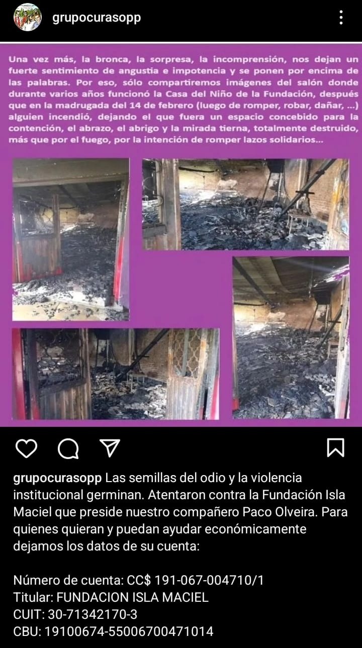 A través de su cuenta de la Red Social Instagram, los Curas en Opción por los Pobres comunicaron que, durante la madrugada del 14 de febrero, la Fundación Isla Maciel que preside el Padre Paco fue víctima de un atentado.