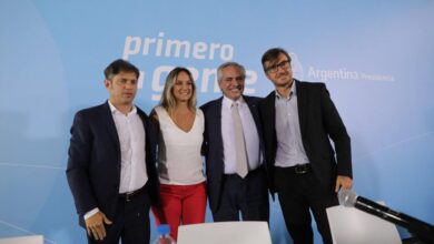 La presidenta de AySA, Malena Galmarini junto al presidente de la Nación, Alberto Fernández, el gobernador bonaerense, Axel Kicillof, el…