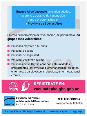 Desde OSPICA, la Obra Social del Personal de la Industria del Cuero y Afines, perteneciente a la Federación Argentina de Trabajadores de la Industria del Cuero y Afines, informan que se suman a la campaña de preinscripción a la vacunación contra COVID-19 «BUENOS AIRES VACUNATE».