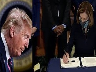 “Hoy, de manera bipartidista, la Cámara demostró que nadie está por encima de la ley, ni siquiera el presidente de Estados Unidos. Que Donald Trump es un peligro claro y presente para nuestro país y que una vez más honramos nuestro juramento al cargo de proteger y defender la Constitución de Estados Unidos, por eso que Dios nos ayude”. Así manifestó brevemente a la prensa, la presidenta de la Cámara de Representantes, Nancy Pelosi, antes de firmar el cargo de juicio político contra el presidente Trump, por segunda vez en la historia.