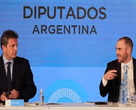 El ministro de Hacienda, flaqueado por el presidente de la cámara baja, Sergio Massa. El ministro de Economía, Martín Guzmán,…
