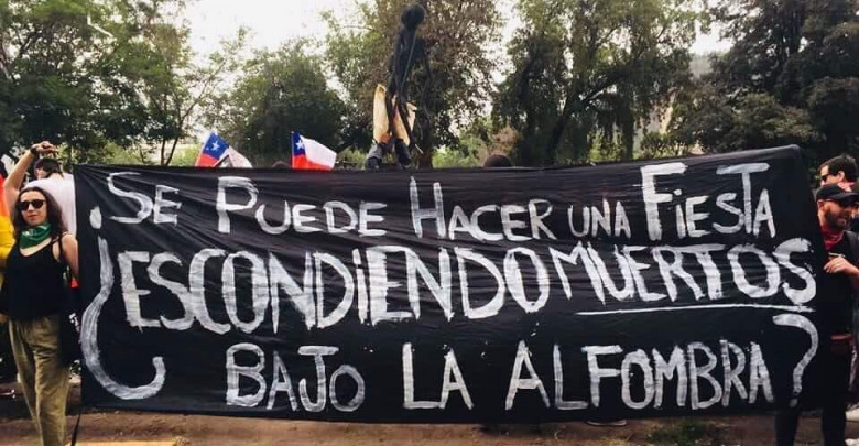 En las calles, coches incendiados, barricadas, y en todos lados, la consigna del momento: «Piñera conchitumadre, asesino igual que Pinochet».