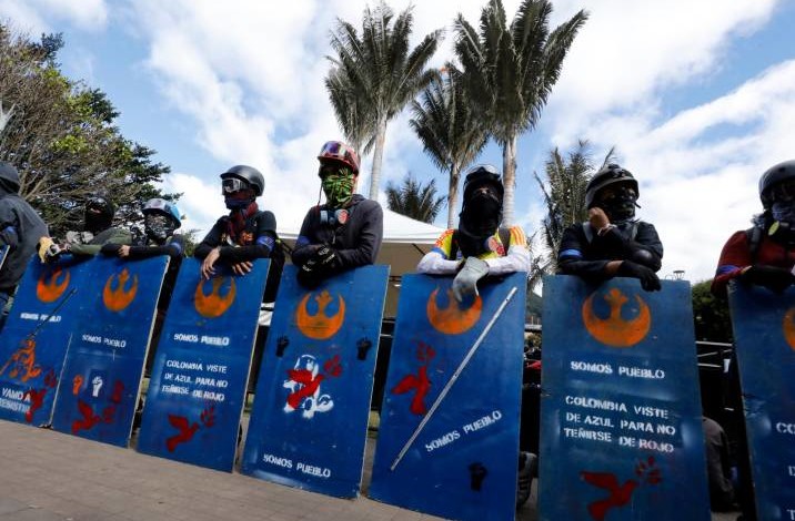 Los escudos de la policía antidisturbios de Colombia exhiben letreros irónicos, tales como “Somos pueblo”, y “Nos vestimos de azules para no teñirnos de rojo”, pero lo cierto es que corrió la sangre, y mucha por las calles de Colombia, y esa es una realidad que no pueden tapar con un dedo.