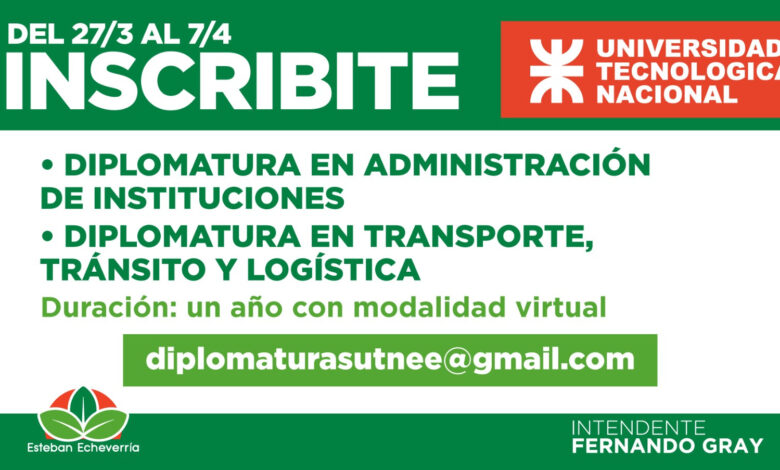 Hasta el 7 de abril se encuentra abierta la inscripción online a las carreras cortas que ofrece la Universidad Tecnológica Nacional (UTN) en Esteban Echeverría. La propuesta académica incluye la Diplomatura en Administración de Instituciones y la Diplomatura en Transporte, Tránsito y Logística, ambas de un año de duración con modalidad virtual.