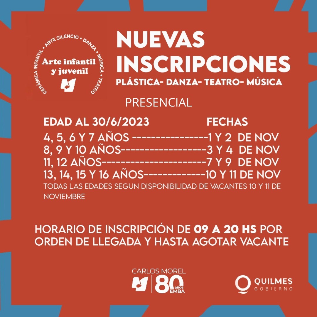 El Municipio de Quilmes informa que se encuentra abierta la inscripción para el segundo semestre de los talleres gratuitos de arte infantil y juvenil en la Escuela Municipal de Bellas Artes (EMBA), ubicada en calle Sarmiento 625, en el centro de la ciudad.