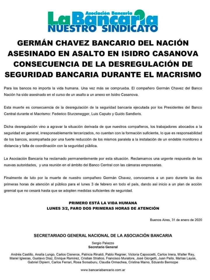 Comunicado de La Bancaria por asesinato de un trabajador durante un robo comando