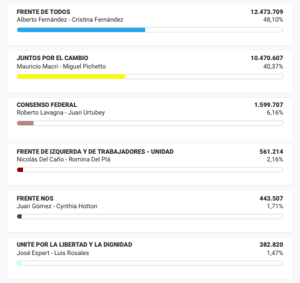 Luego del triunfo de Alberto Fernández se han probado varias sospechas que dejaron importantes consecuencias para el futuro. Se probó que el votante de la derecha es un simple fanático e ignorante, sino como entender que avale a un presidente entregador, hambreador y con un dólar por las nubes. Otra vez se probó que la izquierda es funcional a la derecha. En el 2015 votaron en blanco porque para Nicolás del Caño el peronismo y la derecha son iguales. Este domingo la izquierda perdió 450 mil votos. Del Caño sacó 723 mil en las paso y ahora 488 mil más los votos de Manuela Castiñeira del MAS con 180 mil te suman 415 mil. También se probó que este comicio huele raro. Por ahora, Macri ya sumó 1200000 votos y los Fernández restaron a las Paso 1.400.000. En las Paso hubo 882 mil votos en blanco, el domingo el número fue de 332 mil o sea que 550.000 se arrepintieron y votaron a Macri. Todo muy raro.