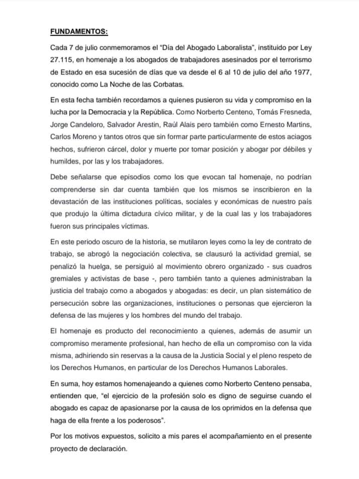 Walter Correa presentó proyecto para que la Cámara de Diputados de la Nación, sume se adhesión a la conmemoración del "Día del Abogado Laboralista", instituido por Ley 27.115, en homenaje a los abogados asesinados durante última dictadura cívico-militar, en la denominada "Noche de las corbatas"