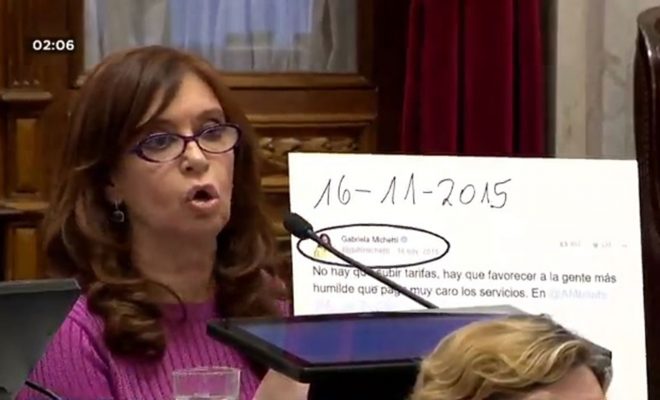 Durante la intervención, la senadora expuso a la presidenta del cuerpo, Gabriela Michetti. Mientras sacaba tapas de diarios y diferentes notas relacionadas con la política tarifarias durante su gobierno, Cristina mostró un viejo tuit de la vicepresidenta en el que comentaba que no había que subir tarifas. “Esto lo decía usted cuando era candidata. ¿Tiene cara para hablar de mentiras en la república Argentina? Se cansaron de mentirles en todo a los trabajadores, que no iba a haber devaluación, que no iban a ir al Fondo Monetario Internacional”, exclamó.