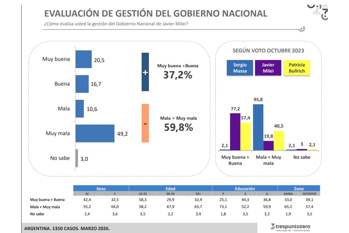 Todos coinciden en que es el peor momento de Milei desde la asunción en diciembre de 2023. También los consultores están de acuerdo en que el Presidente transitó una tormenta en septiembre de 2025, poco antes de las elecciones en que lo salvó la intervención de Donald Trump. Los niveles actuales, no obstante, son peores que los de septiembre. Milei salió de aquel paso, se recuperó con una aprobación por encima del 40 por ciento, pero actualmente toca el punto más bajo: sólo 35 por ciento de aprobación para Córdoba; 37 por ciento Bacman; 37,2 Vilker-Timerman y 37 por ciento Haime. La desaprobación, en cambio, subió fuertemente: 59 por ciento Haime, 62,5 Bacman; 59,8 Vilker-Timerman; y 58 por ciento, Córdoba.