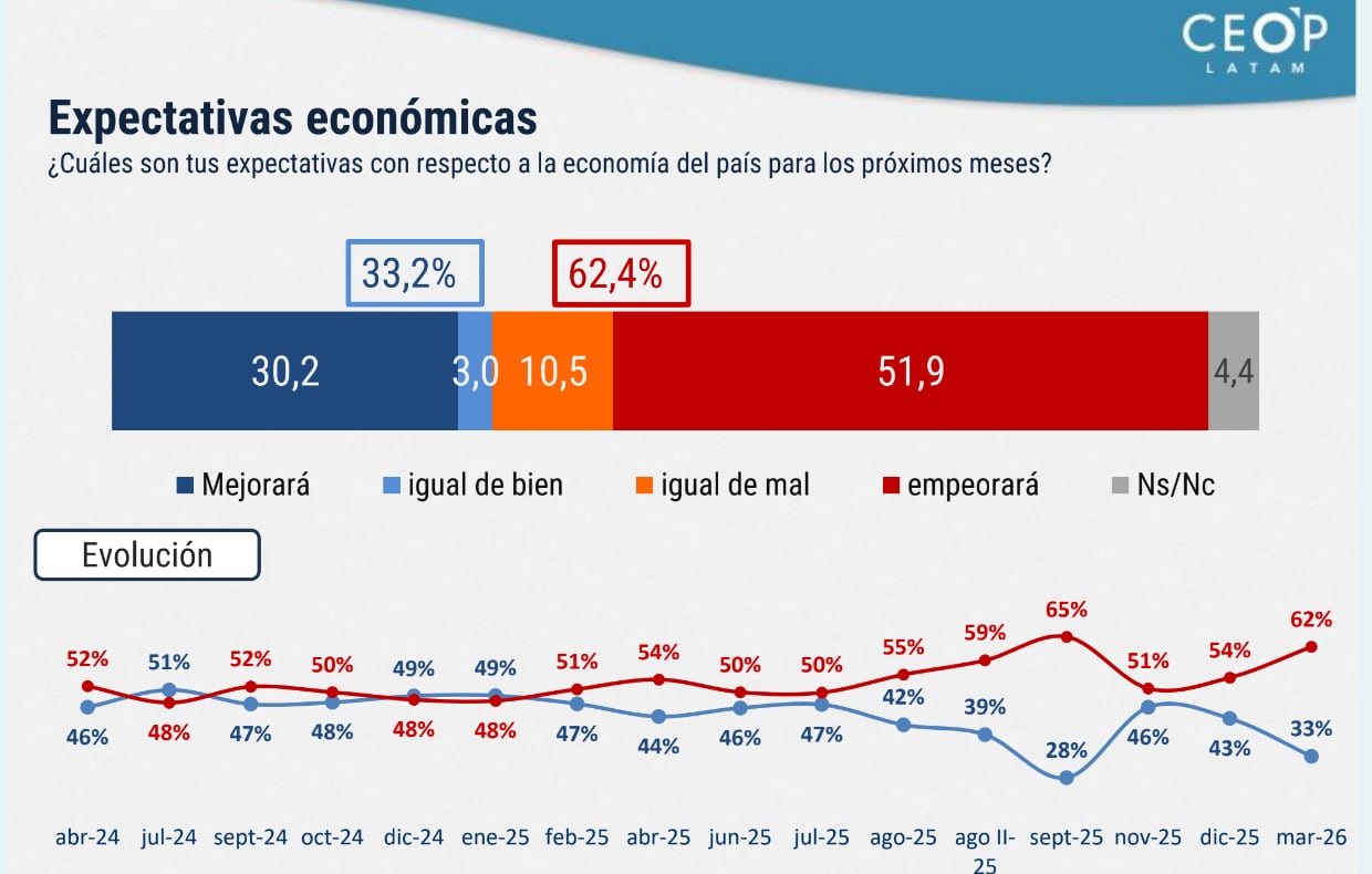 La mayoría de los consultores sostiene que hay un cambio trascendental: los ciudadanos ya no le echan la culpa por la situación a los anteriores gobiernos, sino que la más alta proporción indica que la responsabilidad es de la administración libertaria. También bajaron los niveles de expectativa. Antes, el encuestado decía que estaba mal, pero que pensaba que las cosas iban a mejorar. Ahora, las respuestas apuntan a que las cosas están empeorando.