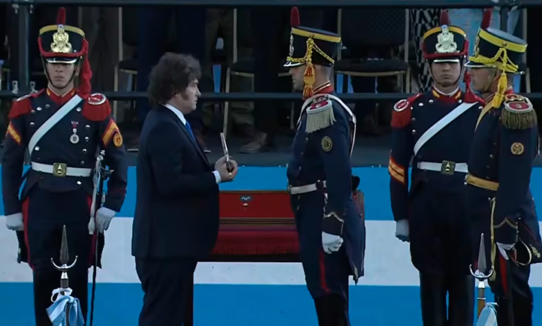 “Hoy consagramos en este acto el retorno del sable corvo del general San Martín al Regimiento de Granaderos. Se trata de la espada que trajo libertad a tierras que solo conocían el sometimiento. El sable no es un objeto histórico más, no es una pieza neutra de exhibición”, manifestó el mandatario en su discurso en Campo de la Gloria, donde se desarrolló el acto principal.