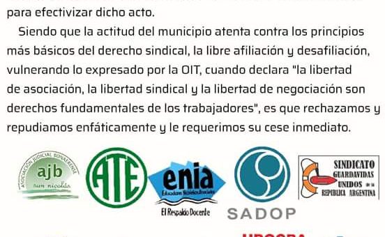 También afirmaron que “siendo que la actitud del Municipio atenta contra los principios más básicos del derecho sindical, la libre afiliación y desafiliación, vulnerando lo expresado por la OIT, cuando declara ‘la libertad de asociación, la libertad sindical y la libertad de negociación son derechos fundamentales de los trabajadores’, es que rechazamos y repudiamos enfáticamente y le requerimos su cese inmediato”.