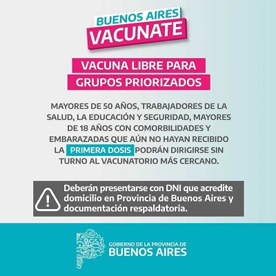 Las personas mayores de 50 años, los trabajadores de la salud, la educación y las fuerzas de seguridad, los mayores de 18 años con comorbilidades y las personas gestantes podrán acceder desde este miércoles a la denominada «vacunación libre», es decir sin turno previo, en la provincia de Buenos Aires.