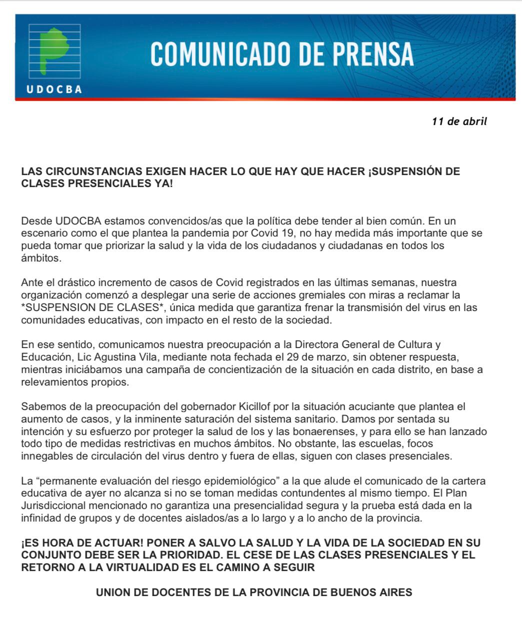 En la misma línea, el sindicalista indica en el comunicado que ante el drástico incremento de casos de Covid-19 registrados en las últimas semanas, desde su organización comenzaron a desplegar una serie de acciones gremiales con miras a reclamar la SUSPENSION DE CLASES, “única medida que garantiza frenar la transmisión del virus en las comunidades educativas, con impacto en el resto de la sociedad”, aseveró Díaz.