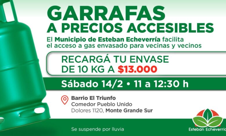 Este sábado 14 de febrero, de 11 a 12:30 horas, el Municipio de Esteban Echeverría realizará un operativo de recarga de garrafas a precio accesible en el Comedor Pueblo Unido, ubicado en el barrio El Triunfo (Dolores 1120), en la localidad de Monte Grande Sur.