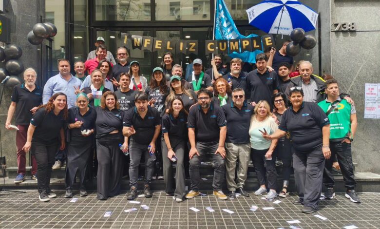 Con la consigna “1 añito sin paritarias y sueldos de la prehistoria”, los empleados montaron un “cumpleaños infeliz” con torta, carteles y un tono de humor que refleja la indignación acumulada.