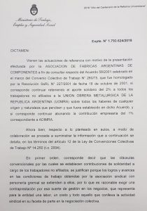 En este caso, la cuota solidaria derivada de los salarios de los metalúrgicos no afiliados es de 2%. El pedido de eliminar ese porcentaje nace de una solicitud de una de las cámaras del sector, la Asociación de Fábricas Argentinas de Componentes.