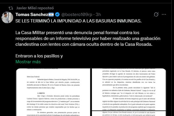 El mensaje incluyó un flyer con la foto de los periodistas de TN, a los que acusa de haber hecho “una cámara oculta sin previa autorización”. “Se terminó la época nefasta de las operetas periodísticas sin consecuencias”, añadió el texto.