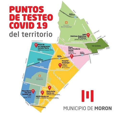 Los testeos masivos se realizan, a partir de las 10hs, los días lunes en la plaza Barrio San Juan de Castelar sur (Betbeder y Miró); los martes en Plaza Villa Rivadavia de Haedo (Magnasco al 900); los miércoles en la Plaza de Los Inmigrantes de Castelar norte (San Nicolás 1800); los jueves en el CAPS Malvinas Argentinas de El Palomar (Cacique Namuncurá 405); y los viernes en la Plaza Evita de Morón sur (Grito de Alcorta y Patagones).