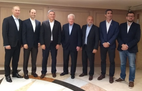 El magnate norteamericano William Franke (en el medio) dueño del fondo de inversión Indigo Partners que controla la low cost JetSmart que opera en El Palomar, en el Hotel Sheraton de Buenos Aires.