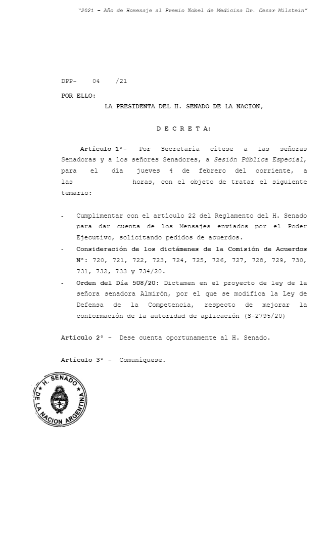 Asimismo se tratará luego el proyecto de ley de la senadora oficialista Ana Almirón, por el cual se modifica la Ley de Defensa de la Competencia, respecto de mejorar la conformación de la autoridad de aplicación.