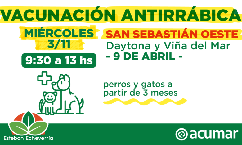 El Municipio de Esteban Echeverría realizará el miércoles 3 de noviembre una nueva jornada de atención a mascotas mayores de 3 meses. En esta oportunidad, el operativo se llevará a cabo en el barrio San Sebastián Oeste, en la localidad de 9 de Abril.