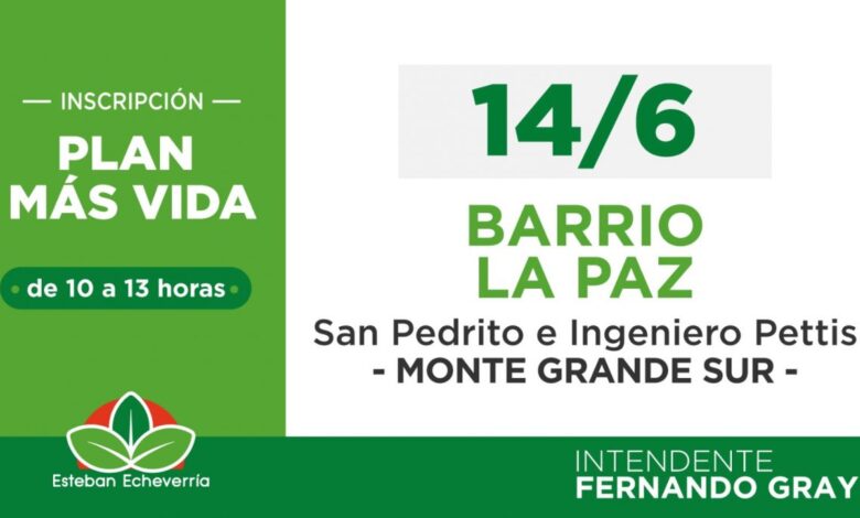 El miércoles 14 de junio, de 10 a 13 horas, el Municipio de Esteban Echeverría llevará adelante una nueva jornada de inscripción al Plan Más Vida en San Pedrito e Ingeniero Pettis, barrio La Paz (Monte Grande Sur). Se trata de un programa destinado a familias con niñas y niños hasta 6 años de edad y personas gestantes en período de embarazo que no reciban la Tarjeta Alimentar.