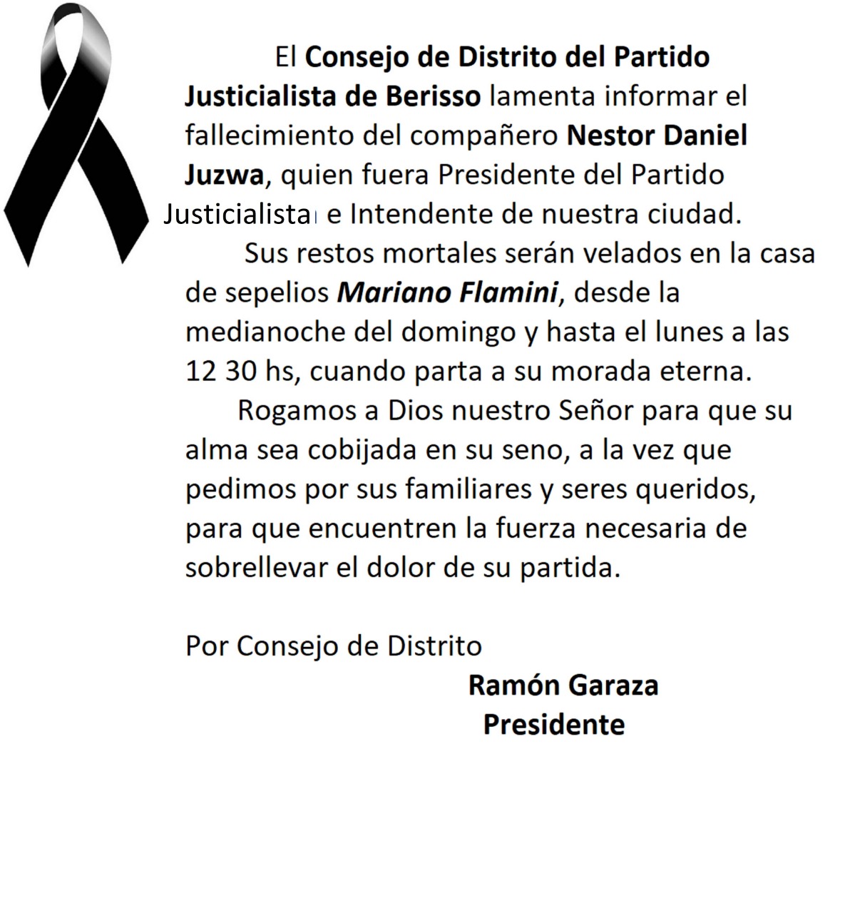 Durante las últimas horas se conoció el fallecimiento del histórico dirigente peronista berissense Nestor Juzwa. Con una marcada trayectoria, fue intendente de Berisso desde el año 1995, sucediendo a Eugenio Juzwa, hasta el año 2003, siendo reemplazado por el ex intendente kirchnerista Enrique Slezack.