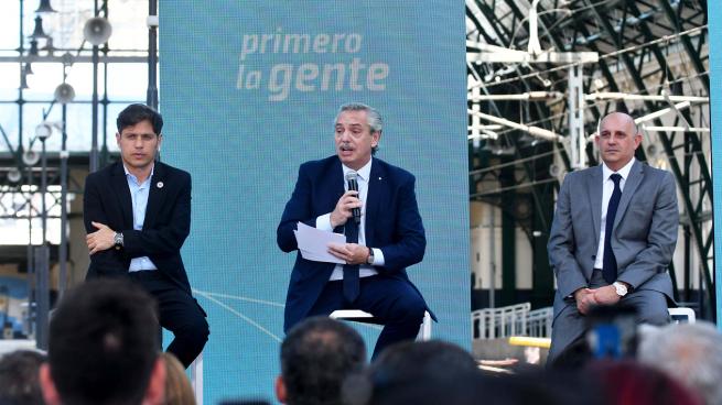 El mandatario nacional estuvo acompañado por el gobernador bonaerense, Axel Kicillof, el ministro Guerrera; la ministra de Desarrollo Social nacional, Victoria Tolosa Paz, y el presidente de Trenes Argentinos, Martín Marinucci.