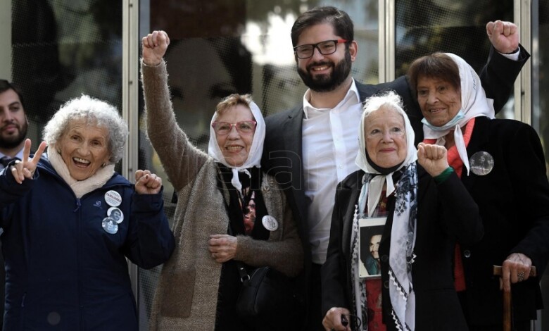 Durante la actividad, representantes de Abuelas de Plaza de Mayo y Madres Línea Fundadora le obsequiaron a Boric el característico pañuelo blanco que usan para sus marchas y reclamaciones.