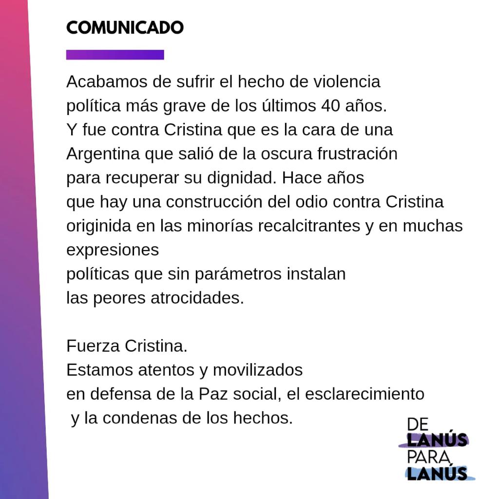 Estamos atentos y movilizados en defensa de la paz social, el esclarecimiento y la condena de los hechos. pic.twitter.com/5oPSiiNexB— #DeLanúsParaLanús ⚡ (@Lanusparalanus) September 2, 2022