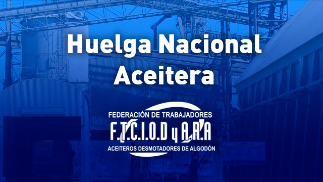 La Federación de Trabajadores del Complejo Industrial Oleaginoso, Desmotadores de Algodón y Afines de la República Argentina comunica que en el día de fecha da comienzo a un plan de lucha, cuya primer medida de acción de acción directa comienza a las 14 horas de hoy con una huelga en las plantas aceiteras del país, tras la provocación por parte de la representación patronal de las cámaras CIARA, CIAVEC y CARBIO al negarse a la revisión de la escala salarial prevista para el mes de agosto pasado.