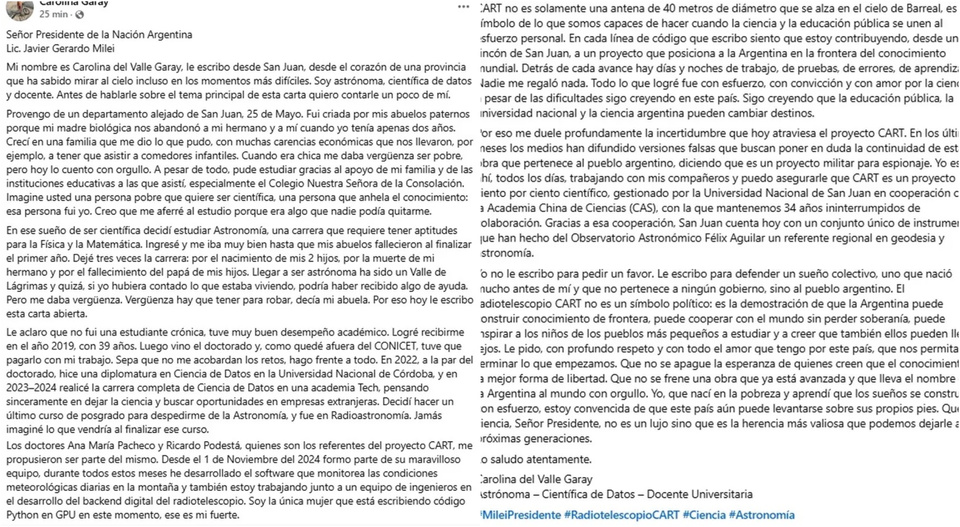 Luego de que el Gobierno decidiera suspender el proyecto de creación de un observatorio espacial en el Complejo Astronómico El Leoncito (CASLEO) de San Juan, denominado Radiotelescopio Argentino-Chino (CART), la astrónoma y docente universitaria Carolina del Valle Garay publicó una carta abierta dirigida al presidente Javier Milei en la que repudió este accionar al remarcar el valor de la ciencia argentina, y a modo de ejemplo, relató su propia experiencia.