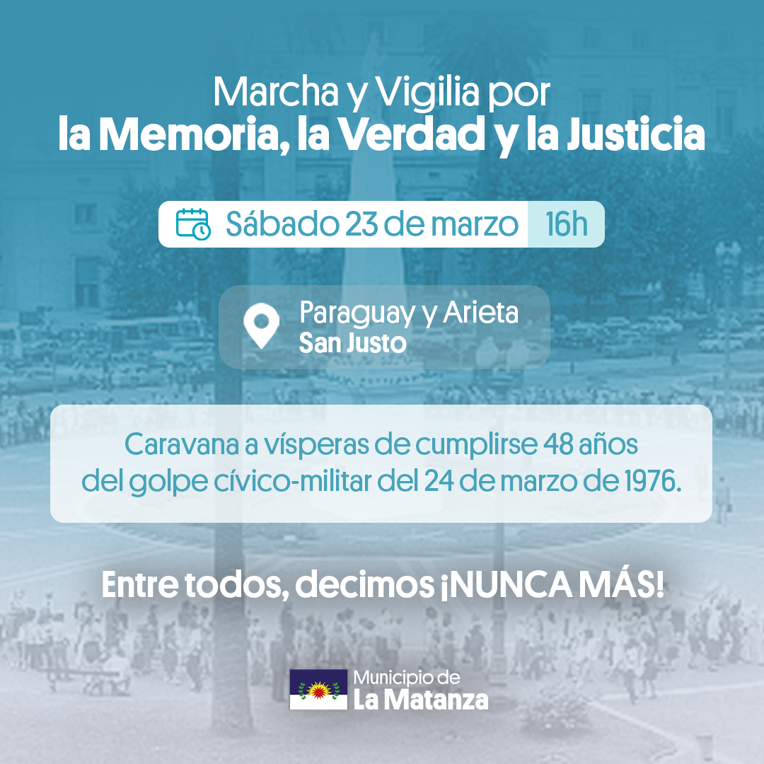 Con motivo de cumplirse 48 años del golpe cívico-militar ocurrido el 24 de marzo de 1976, el Municipio de la Matanza, a través de la Subsecretaría de Derechos Humanos, realizará una nueva vigilia por la memoria, la verdad y la justicia.