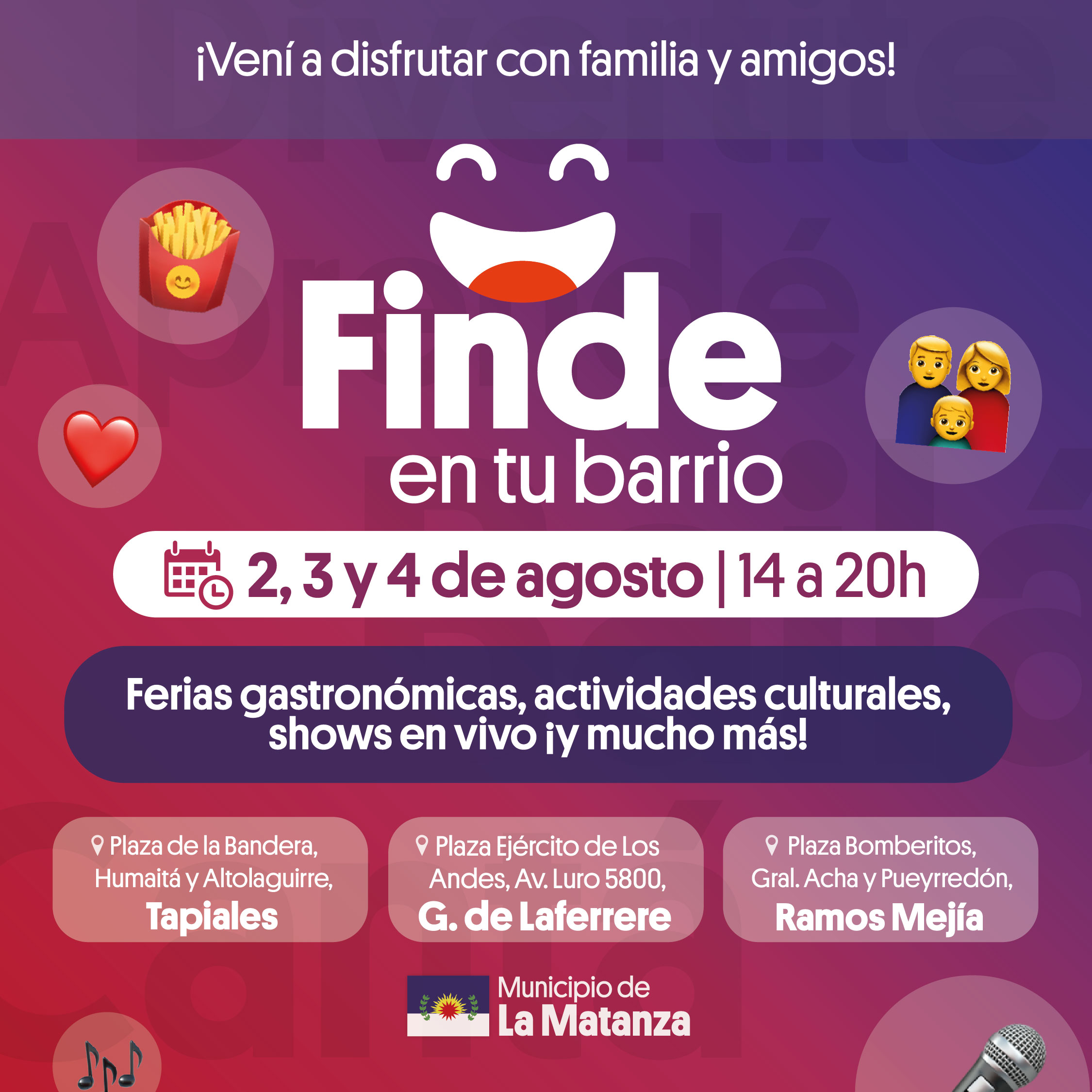 Este fin de semana, 2, 3 y 4 de agosto, Finde en tu barrio se hará presente en las localidades de Gregorio de Laferrere, Tapiales y Ramos Mejía, desde las 14 horas.