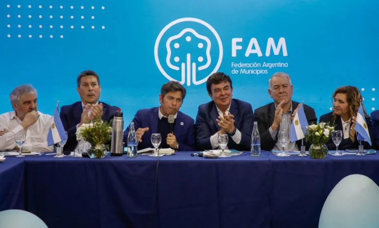 El presidente de la Federación Argentina de Municipios (FAM), Fernando Espinoza, y el gobernador Axel Kicillof encabezaron la Asamblea de la FAM.