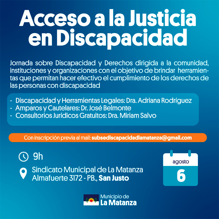 El Gobierno local impulsa continuamente diferentes iniciativas que brinden herramientas de sostén para toda la comunidad. En esta oportunidad, desde la subsecretaría de Discapacidad, perteneciente a la Secretaría de Desarrollo Social municipal, se realizará la jornada Acceso a la Justicia en Discapacidad, que tendrá lugar el martes 6 de agosto, a las 9 horas, en el Sindicato Municipal de La Matanza, ubicado en Almafuerte 3172, San Justo.