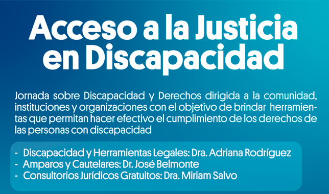 La Jornada abordará las temáticas: Discapacidad y Herramientas Legales, Amparos y Cautelares, y Consultorios Jurídicos Gratuitos; y estará a cargo de los profesionales: Adriana Rodríguez, José Belmonte y Miriam Salvo, representantes de la Defensoría General y el Colegio de Abogados de La Matanza.