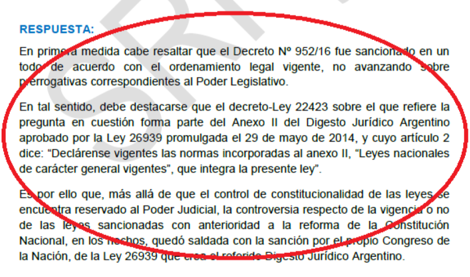 «En tal sentido, debe destacarse que el decreto-Ley 22423 sobre el que refiere la pregunta en cuestión forma parte del Anexo II del Digesto Jurídico Argentino aprobado por la Ley 26939 promulgada el 29 de mayo de 2014, y cuyo artículo 2 dice: «Declárense vigentes las normas incorporadas al anexo II, Leyes nacionales de carácter general vigentes?, que integra la presente ley.