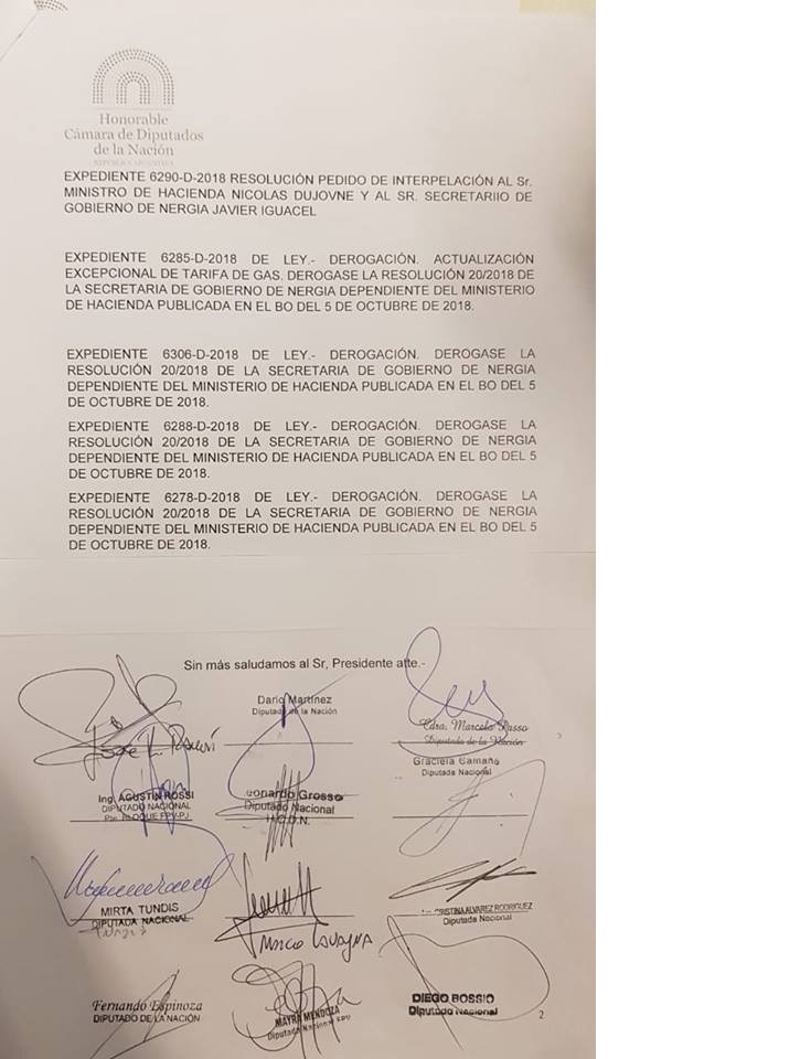 Al pedido del FpV-PJ en el Congreso, se han sumado casi todos los bloques de la oposición, entre ellos el Frente Renovador, el Movimiento Evita y la Izquierda, entre otros que firmaron el pedido de sesión especial para tratar el «escandaloso» nuevo aumento del gas y se derogue la Resolución 20/2018 de la Secretaria de Energía, así también, interpelar a Javier Iguacel, al ministro de Hacienda Nicolás Dujovne y al titular del Enargas, Mauricio Roitman.