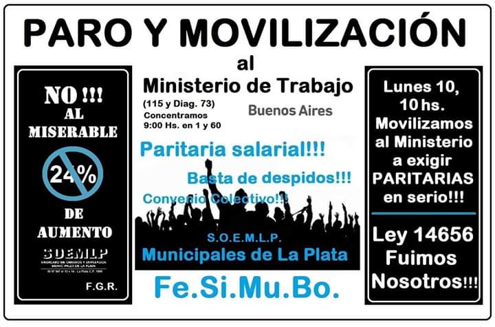 Ante la falta de respuesta de parte del Sr. Horacio Barreiro, Viceministro de Trabajo de la provincia, quien debe convocar las paritarias municipales, el SOEMLP llevará una acción directa. La medida se decide luego de que el Ministerio convocara a paritarias en el marco de la Ley 14656 el pasado 5 de noviembre, y que las autoridades de la Municipalidad de La Plata y el Sindicato de Trabajadores Municipales no concurrieran y no fueran sancionados, como así también del urgente pedido de continuidad de la negociación colectiva.