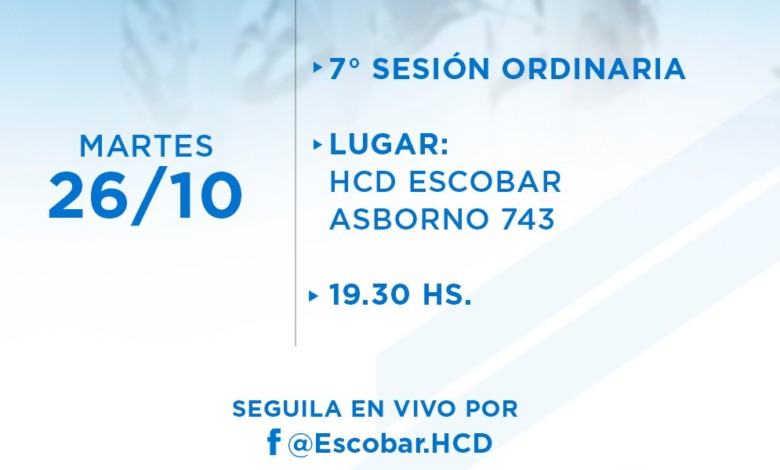 El Concejo Deliberante llevará a cabo la Séptima Sesión Ordinaria el martes 26 de octubre, a las 19:30 horas, en el recinto sito en la calle Asborno 743 de la ciudad de Belén de Escobar, con estrictas medidas de bioseguridad, cumpliendo las normativas de prevención ante la pandemia de COVID-19.