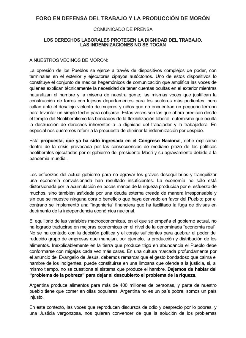 Desde el Foro en Defensa del Trabajo y la Producción de Morón manifestaron su oposición a los actuales proyectos ingresados al Congreso Nacional de eliminación de la indemnización, sostuvieron que “los derechos laborales protegen la dignidad del trabajo” y presentaron un documento donde reclamaron: “Dejemos de hablar del problema de la pobreza para dejar al descubierto el problema de la riqueza”.