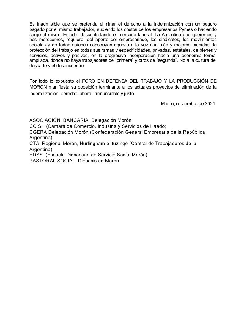 En una convocatoria del Foro en Defensa del Trabajo y la Producción, integrado por la Asociación Bancaria delegación Morón, la Cámara de comercio, Industria y Servicios de Haedo, la Confederación General Empresaria delegación Morón, la CTA regional Morón, Hurlingham e Ituzaingó, la Escuela Diocesana de Servicio Social Morón y la Pastoral Social local, comunicaron el rechazo a los proyectos de ley presentados por la oposición para modificar las indemnizaciones.
